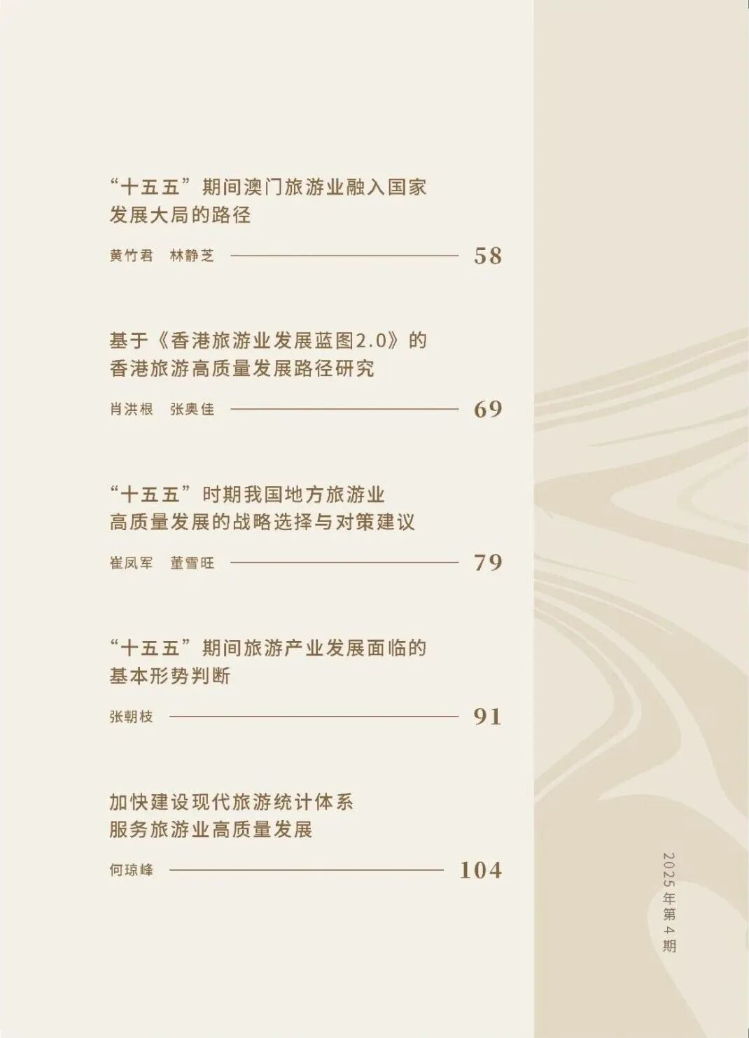 来自内地高校和研究机构的三篇文章对国家和地方“十五五” 旅游业发展规划的编制具有参考意义和借鉴价值。绍兴文理学院党委书记崔凤军教授从地方视角有针对性地提出了非均衡发展、市场化改革、强化科技引领、优化治理结构等四项策略,其中启动县域旅游推广计划、培育旅游人才等建议尤其有现实针对性。复旦大学张朝枝教授长期从事文化、文物与旅游融合研究,在总结过去20年投资驱动型旅游发展模式的基础上,分别从旅游市场需求变化和政府的资源管理政策两个方面得出旅游业未来五年的发展趋势。其针对国家“十五五” 旅游业发展规划的建议兼具了理论高度和实践可行性, 很是值得阅读。中国旅游研究院统计调查所所长何琼峰博士结合多年的旅游统计实践经验,从强化统计职能、完善统计制度、优化采集体系、提升统计质量,以及监管、保障和人才培养等方面,提出了现代旅游统计体系的建设意见,是旅游业打基础、立长远的务实举措。