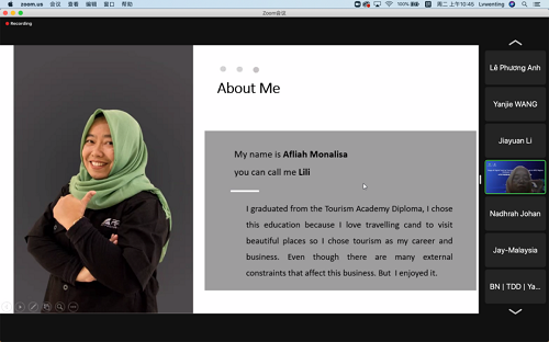 随后,刘祥艳博士介绍了此次研讨会4天的全部议程,并对19日议程进行了说明。19日会议的主题是《旅游中小微企业的数字工具应用:实践与经验》(Usage of digital tools by tourism MSMEs: Practice and experience)。