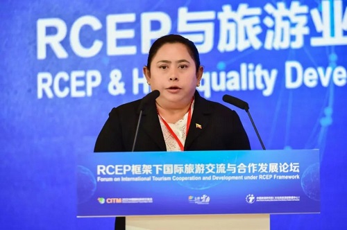 缅甸总领馆商务领事WAI YEE LIN(伟怡琳)致辞。作为东盟大陆国家中最大的国家,缅甸全年都有许多吸引力旅游目的地,旅游部门大约贡献了10%的GDP,而这一占比还有很大的发展空间。由于RCEP成员国的开放承诺,成员国国民也可以在包括旅游业内的许多领域中受益,通过创新促进当地经济发展。相信缅甸对于区域经济合作的承诺能够促进成员国之间的共同繁荣未来。