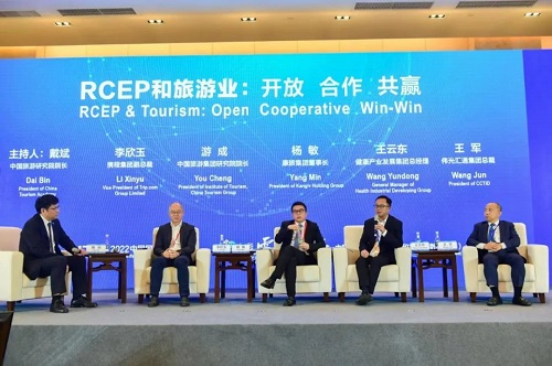 中国旅游研究戴斌院长主持了企业家的专题对话。戴斌院长与携程集团总裁李欣玉、中国旅游集团研究院院长游成、康旅集团董事长杨敏、健康产业集团总经理王云东、伟光汇通集团总裁王军等嘉宾共同围绕“RCEP和旅游业:开放·合作·共赢”展开了热烈的讨论。