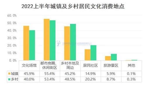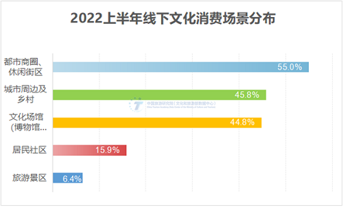 国内文化和旅游休闲半径进一步收缩,本地化、近距离、多样化的文化消费占据主导。2022上半年,居民文化消费的线下场景主要集中在都市商圈/文化街区、文化场馆、城市周边及乡村。