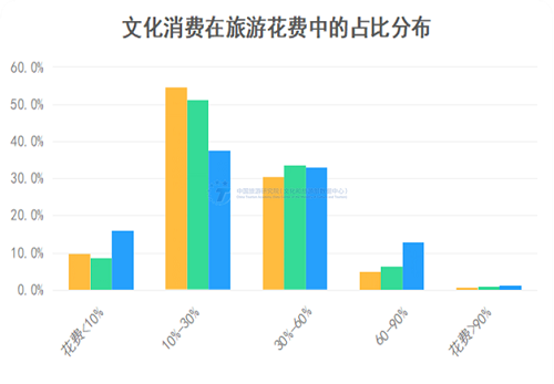 超过九成的受访者表示会在旅游中进行文化消费。游客的文化体验内容包括文化场馆参观(29.6%)、打卡文艺小资目的地(46.1%)、看剧观展(47.9%)、演艺/节事(31.1%)、民俗体验(16.1%)等。从消费支出结构看,文化消费在旅游支出中的比重主要集中在10%-30%和30%-60%区间。