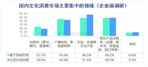以文化为核心的非遗活化、文创开发是消费市场的重要内容。专项调研数据显示,文化消费支出中以文创为代表的购物占比达到了55%。“文创+非遗”让传统文化以全新形象出现在公众视野,促进了文化传播与传承,提高了国民的文化认同和文化自信,为文化消费增长提供了有力支撑。现阶段,国内文化消费主要集中在文创及非遗等文化产品、娱乐产品及服务、文化出版物、广播电视及影视剧院等领域。从长远角度出发,57.4%的受访企业认为文化消费市场将向文创、非遗等文化产品集中。