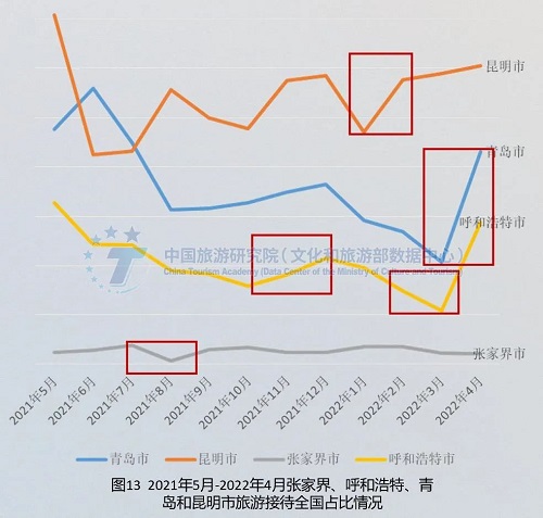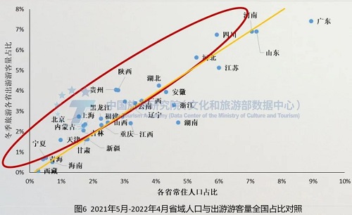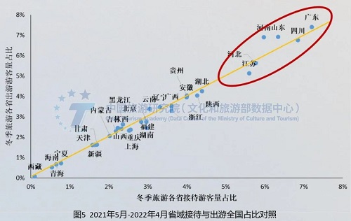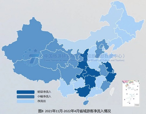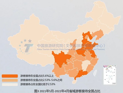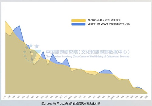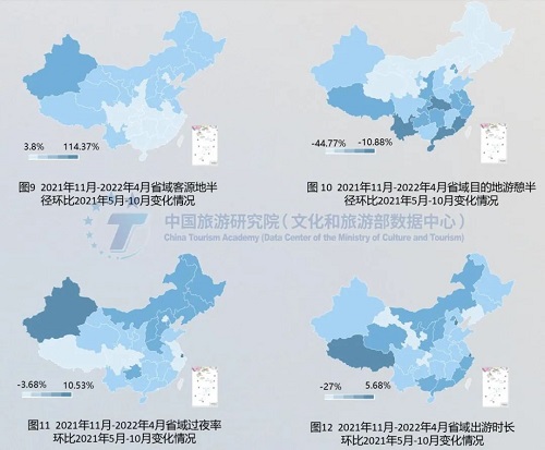 各地对疫情风险认知和出游限制差异较大,总体表现为北方大于南方。广东、山东、陕西、贵州、辽宁、黑龙江、吉林、上海和天津等省市,2021年5月-10月居民出游占比明显高于2021年11月-2022年4月。受疫情影响,2021年11月-2022年4月省内居民出游行为受到抑制,出游市场收缩幅度较大,河南、四川、湖北、安徽、云南、广西、湖南、江西等省份的居民出游占比相对更高。总体而言,北方对疫情风险认知和出游限制大于南方,南方城市游客出游需求转化为出游实际出游行为更为顺畅。