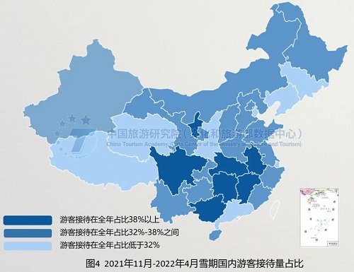 南方旅游市场活跃度更高,冬奥会的冰雪旅游带动力因疫情受阻。从2021年5月至2022年4月各省市游客接待量全国占比来看,大于2.53%的省市大多分布在南方,表明南方旅游市场活跃度高于北方。去年11月至今年4月,雪期省域游客接待量全国占2021年5月至2022年4月游客量的比重平均约34.43%,“南下北上特征”不如往年明显,四川、湖北、湖南等南方中部省份游客接待占比较高。北方地区虽充分利用北京冬奥会机遇和区域自然资源优势,围绕冰雪运动、冰雪观赏等提质扩容,但受疫情影响冬奥会对冰雪旅游市场的带动力没能充分发挥。