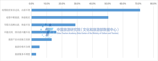 疫情管控导致“盲盒式出游”体验不佳是游客满意度下降的主要因素。2022年,不可预期的出游环境降低了游客获得感和满意度,中国旅游研究院游客行为专项调研(以下简称“游客行为调研”)数据显示,41.5%的受访者表示2022年出游频率低于2021年。认为出游体验不如去年的受访者比例为10.3%,明显高于2021年的4.7%。从调查结果看,疫情防控要求过高导致出行不便(71.2%)、散发疫情中断旅游(50.4%)、节假日高峰出游(28.8%)是游客满意度下降的主要原因。