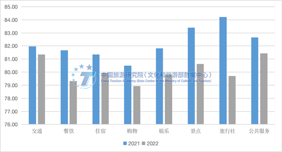 2022年全国游客满意度综合指数80.52,同比下降2.37%,为2016年以来的首次回落。从细分指标看,现场调查游客满意度指数83.19,同比下降3.21%;网络评论游客满意度指数78.84,同比增长0.76%,整体与2021年持平;投诉与质监游客满意度指数68.30,同比下降2.95%。因突发疫情导致旅行强行终止、退款纠纷、酒店无法入住、隔离期间权益受到损害等问题,致使游客体验和综合满意度下降。