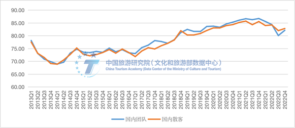 图4:2013—2022年分季度国内团队、散客满意度指数