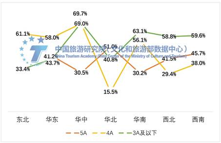 图2.七大区域不同级别旅游景区平均预约率对比图