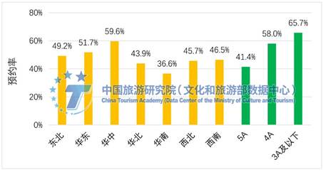 七大区域中,华中地区预约率最高达59.6%,其后依次是东部、西部、南部地区。低级别景区线上依存度高,高级别景区线下直销更有市场,A级景区预约率分布呈倒金字塔形状。5A景区资源吸引力大,市场认可度高,直销渠道占比更多,全年平均预约率最低,为41.4%,3A及以下景区比5A景区高出24.3%。
