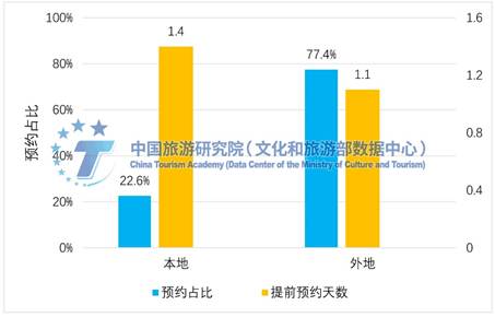 外地人预约多,本地人预约早。全年景区门票总预约人数中外地游客占比77.4%,本地游客占比22.6%,相比本地游客,外地游客更愿意预约入园。相较于外地游客,本地游客对本地景区预订渠道更熟悉,预约时间比外地游客早,本地游客平均提前1.4天预订景区门票,比外地游客多0.3天,外地游客更喜欢到达目的地之后边游边预约。