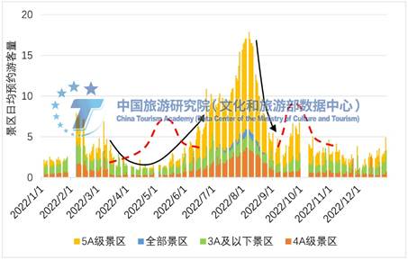 景区预约对大都市疫情的敏感度高,存在“一地有疫情全国受影响”现象。第二季度上海疫情爆发,多地采取封控政策,景区开放率降低,客流量减少,本应出现游客量小波峰的5月变成了低谷。6月、7月疫情得到控制,西藏、新疆吸引了大批量游客,全国游客量缓慢上涨;8月初西藏疫情反弹,8月中旬至9月初全国景区旅游市场急速收缩,10月份的小波峰也受到冲击,总游客量减少。