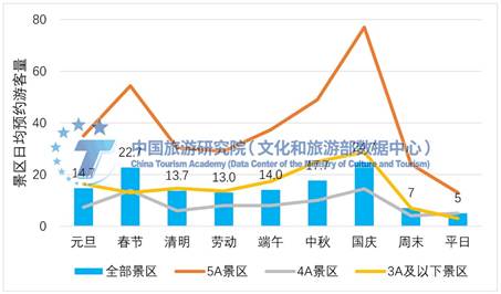 节假日景区日均预约游客量是周末的2.6倍,平日的3.7倍。国庆节和春节景区日均游客量最高,其后依次是中秋节、元旦、端午节、清明节,劳动节预约量受疫情影响最为显著。各级别景区日均游客量的季节性变化规律具有较强一致性,分别在春节之后、暑假、十一之前有波峰。其中,5A级景区季节性变化幅度远大于其它景区,推高了A级景区预约变化幅度。