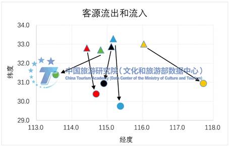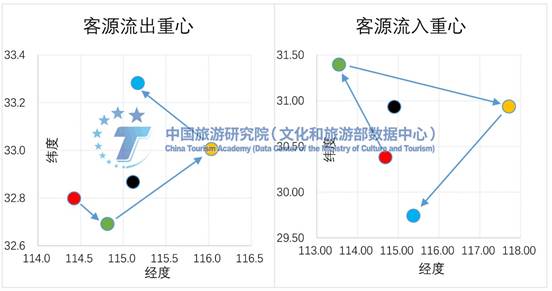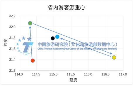 跨省游客源流出重心位于(115.12°E,32.87°N),流入重心位于(114.91°E,30.93°N),省内游客流重心位于两个点位中间。
