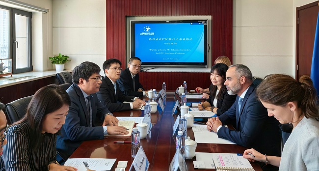 ETC营销部负责人吕迪Ludivine Destree、中国区主席谷林Ms Franka Gulin及我院总统计师马仪亮、人事与行政部主任夏少颜、国际研究所所长杨劲松、副研究员刘祥艳等人参加了会见。