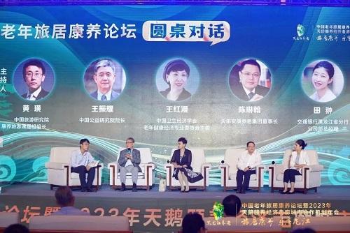 论坛举办了圆桌对话会,中国公益研究院院长王振耀、中国卫生经济学会老年健康经济专业委员会主委王红漫、天佑安康养老集团董事长陈琳翰、交通银行黑龙江省分行公司部总经理田翀、中国旅游研究院康养旅游课题组长黄璜围绕“医养康养相结合的旅居环境创新”和“全生命周期的旅居康养产品体系”两大主题,深入探讨了我国老年康养旅居产业的发展前景、存在问题、提升战略。