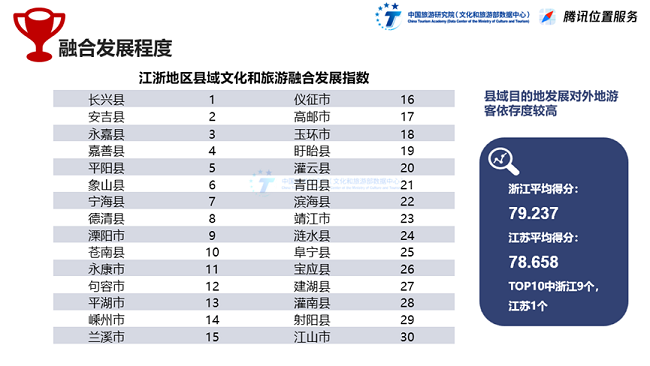 县域目的地对外地游客依存度更高。浙江省县域文化和旅游融合发展总指数得分79.237分,江苏省得分78.658分。浙江省文化和旅游融合发展水平相对更高。对比县域文化和旅游融合发展总指数与常住人口数量排名数据,本地人口数量与文旅融合发展相关度较低,例如德清、安吉、长兴等县城在本地人口基数相对较低情况下,文化和旅游融合发展较好。表明在本地人口基数基本处于同一量级时,本地游客消费对于县域目的地文化和旅游融合发展的贡献度有限。外地游客的进入,可以强有力地推动文化和旅游产业精品项目的优化和发展。