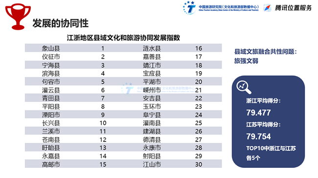 县域文旅融合存在旅强文弱的普遍性特征。文旅融合的过程既是“创业”,是夯实物质基础;又是“塑形”,是共建精神家园。结合县域文化和旅游协同发展指数的数据分析,浙江县城文旅协同发展平均得分79.477分,江苏省平均得分79.754,前10个县城中,浙江和江苏各5个。在30个样本县城中,近2/3的县城属于旅强文弱类型,也就是说63.3%的县域,文旅融合受到了文化发展水平的制约。强旅游驱动力特征,侧面表征了更加深刻而广泛的文化挖掘亟须注入县域文旅发展进程中。