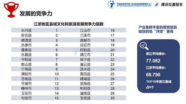 产业聚集度高、度假型县域目的地竞争力强劲。长兴县、安吉县、德清县等凭借逐步建立的乡村旅游、生态旅游、绿色旅游产业集群和不断完善的商、住、文、艺等多类型配套设施,丰富了目的地旅游产品类型,满足了游客出游与消费需求,扩大了目的地享誉度和产品感知度,拉高了县域文化和旅游发展竞争力水平。