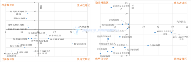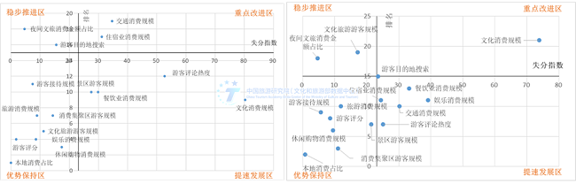 以失分情况和排名构建坐标轴,形成供给侧和需求侧优劣势象限划分图。在供给侧的两张图上,以宁海县和溧阳市为代表的县域目的地在文旅融合发展过程中供给端无明显短板,大部分指标均在优势保持区。其景区景点、文博场馆、城市公园、消费集聚区等构成的文旅融合要素体系发展非常完备。需求端优势弱于供给端优势,住行游相关消费欠缺,吃娱购相关消费相对领先。