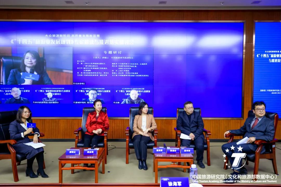 2022年1月21日上午,《“十四五”旅游业发展规划》专家解读与推进落实研讨会以线上线下相结合的方式在京召开。会议主题为“大众旅游新阶段高质量发展新蓝图”,旨在深入解读《“十四五”旅游业发展规划》,做好规划宣传、贯彻和落实工作,助力旅游业高质量发展。来自文化和旅游部资源开发司、上海市文化和旅游局、湖北省文化和旅游厅、首旅集团、中青旅控股、陕西旅游集团、景域驴妈妈集团,以及云南大学、北京第二外国语学院、洛阳师范学院、澳门管理学院、澳大利亚格里菲斯大学的嘉宾以线上线下的方式参加了会议。我院院长戴斌出席研讨会并做了总结演讲。