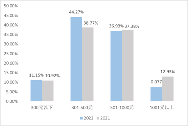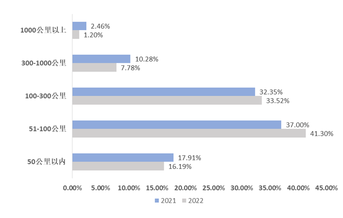 假日旅游市场恢复较缓,呈现居民出游意愿、出游半径和人均消费三方面收缩。受陕西、浙江、河南散发疫情和局部地区降雪天气影响,居民对出游普遍表现出观望态度,出游决策时间提前期缩短,想出游与真出游之间的差距拉大,居民出游意愿(图1)较2021年同期下降5.02个百分点。居民出游半径(图1)由2021年的136.3公里收缩到110.3公里,收缩至去年同期的80.9%,目的地游憩半径和去年基本持平,“就地过节”成为多数人的选择。游客人均消费(图2)较去年同期也呈现收缩态势,人均消费普遍集中在500元以内,500元以内消费的游客较去年同期增加了6.08个百分点,千元以上消费降幅较大,达12.8%。