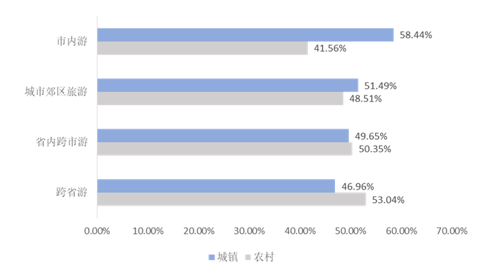 “非必要不出行”带动“本地人游本地”,旅游市场近程化特征明显。受疫情影响,多地发布非不要不离省(市)等从严从紧通知,“就地过节”促使居民出行范围(图3)以短途、近郊、省内游为主,专项调查结果显示,元旦假期跨省游比重较去年同期略有下降,省内跨市游比重有所增加,提升了4.9个百分点。城镇居民普遍选择省内、市内及城市周边近郊游,农村居民跨省游比重反而高于城镇居民(图4),此类现象可能和政策的普及程度相关。