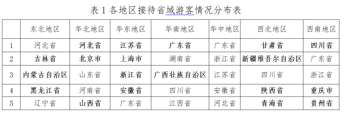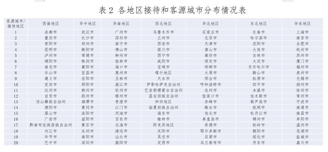 旅游市场区域内循环作用突出,省域、市域间的联动效应仍然明显。从区域接待视角分别分析其客源地省份和城市的分布情况(表1),可以看出,各地区承接跨省游游客主要以区域内的省域游客为主,分布相对集中,其中,华东和西北地区表现较明显。从客源城市上看(表2),区域接待客源城市的分布较省域表现出深一层次的递进,省域城市之间的联动性较强。游客在区域内相邻省域、市域流动性较大,区域内循环表现仍然突出。其中,西南地区省域内循环明显,客源城市前20位中7成来自四川省;华中、华南地区客源城市分布相对较平均,分别集中在湖南、湖北、广西和广东四省;西北、东北、华北和华东地区则表现为区域内循环,客源城市分布相对较丰富。