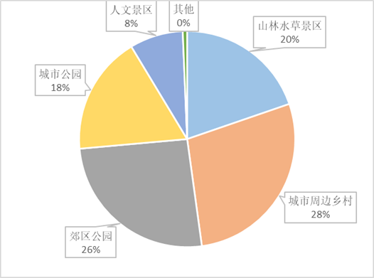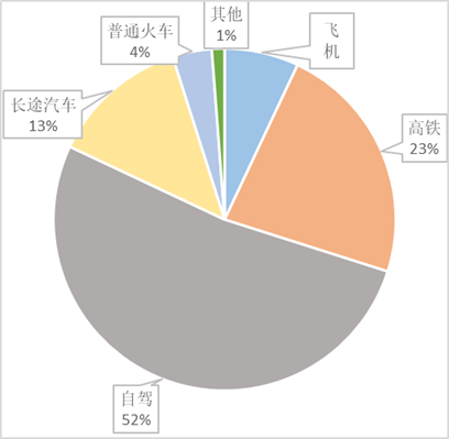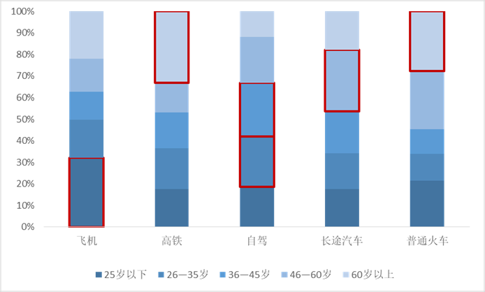 自驾游仍为主要出行方式,自驾游区域分布与城市密度呈正相关。从游客出行方式来看(图6),安全性高、私密性强的自驾游仍为游客出行主要选择,调查结果显示,半数以上游客选择自驾出行。从年龄分布上看(图7),中青年为主要自驾游群体,占比过半,25岁以下的年轻人较多选择飞机出行,60岁以上客群偏爱火车和高铁出行。