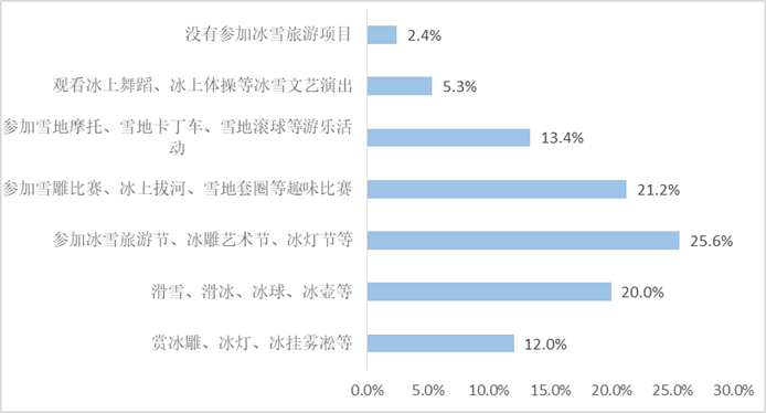 冬奥效应让冰雪休闲市场加速释放,文化休闲成为假期旅游新风尚。文化冬奥会举办在即,冰雪为主体的本地游、周边游持续升温,城乡居民的冰雪旅游、冰雪休闲、温泉体验在一些地区的热度上升。长白山、张家口等传统冰雪旅游风景区热度走高,各地积极探索将冰雪旅游融入夜经济,增强夜间休闲对游客的吸引力,丰富冬季旅游休闲生活。调查结果显示(图12),调查者中仅2.4%的游客未参与冰雪休闲类活动,其中,冰雪旅游节、冰雕艺术节、冰灯节的参与度最高,滑雪、雪橇、冰球、冰壶等各种冰雪类体育运动也深受游客喜爱。冰雪休闲旅游正从小众市场向大众休闲转变。综合多方数据显示,假日期间,城市周边雪场表现较好,如,武汉神农架滑雪场三天接待游客超过2万人次,贵州梅花山滑雪场和玉舍滑雪场累计接待游客1.86万人次,同比增长21.50%,吉林北大湖滑雪场共接待旅游人数2.6万人次,同比增长10%,新疆各滑雪场共接待旅游人数2.72万人次。冰雪运动在满足人民对冰雪体验的向往同时也促进了当地旅游消费。