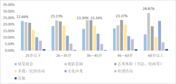 文化休闲同样为元旦假日旅游增添一抹亮色,从供给侧看,各地积极依托城市旅游休闲街区、文旅消费集聚区创新假日文旅产品供给。南京博物院、南通文化馆、大钟寺古钟博物馆、济宁图书馆等打造跨年线上展,带领群众“文化跨年”;上海、安吉、西来古镇、普洱等地推出非遗文化集市,打造“文创+非遗”新场景。非遗研学游、民俗文化游、家庭亲子游产品备受游客喜爱,蕴含国潮的文化跨年方式更受年轻游客欢迎,旅游消费也向年轻化趋势转变。需求侧数据显示,元旦假日,超过83%的游客参与了两项及以上的文化游览活动,73%的游客参与文化活动时间在2小时以上,超半数游客参与博物馆、图书馆等公共文化场馆及文化街区的休闲体验。从年龄分布上来看9(图13),25岁以下游客热衷展览展会,26-45岁及60岁以上游客喜爱观影赏剧,46-60岁游客对参与艺术体验的兴趣浓厚。