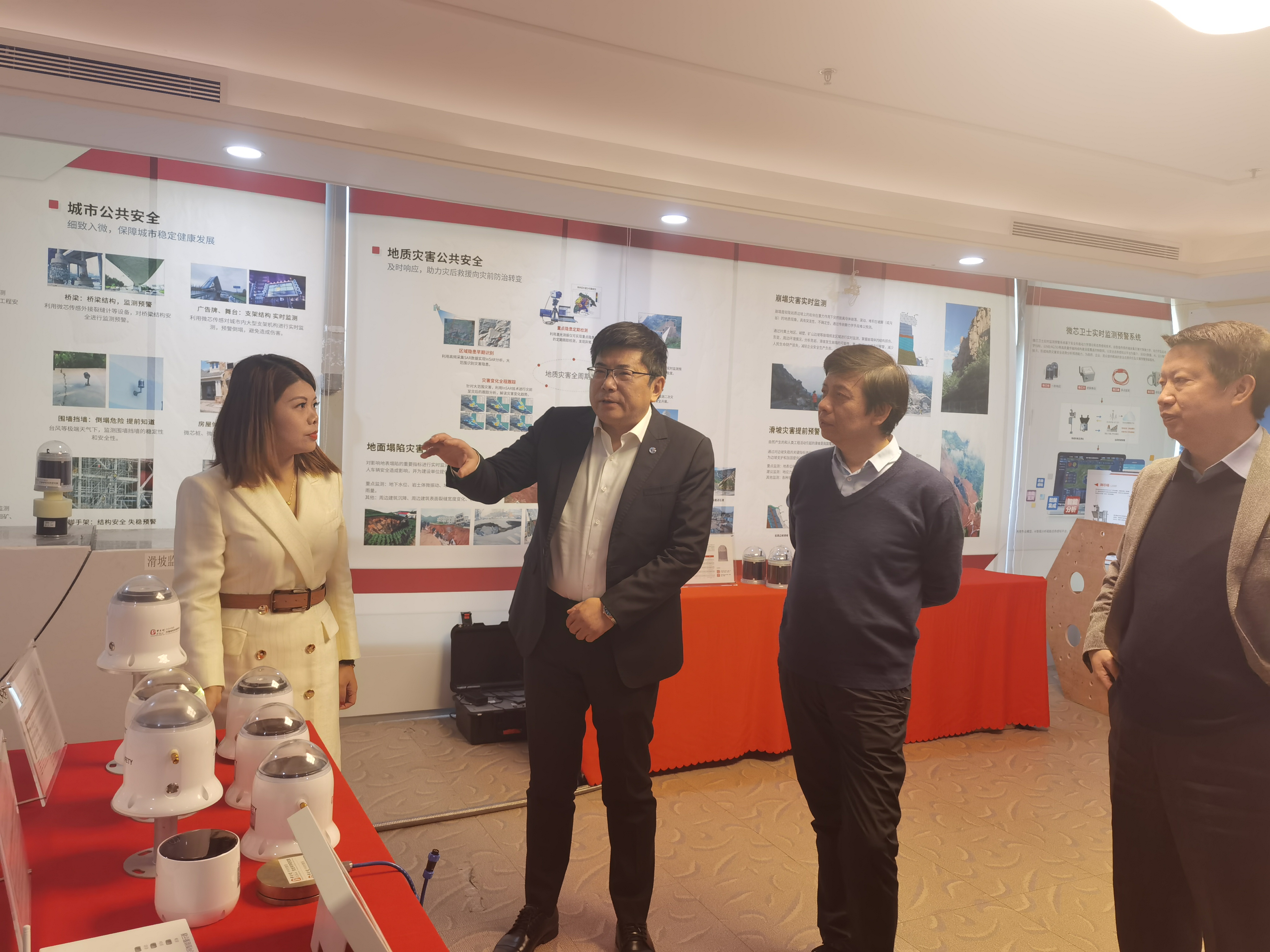 在参观预警装备成果展示过程中,戴斌院长详细询问了相关技术的实现路径,数据获取与分析等问题,对公司在隐患早期识别、远程定期检测、实时态势感知、安全检测预警等方面做出的成绩表示赞赏。