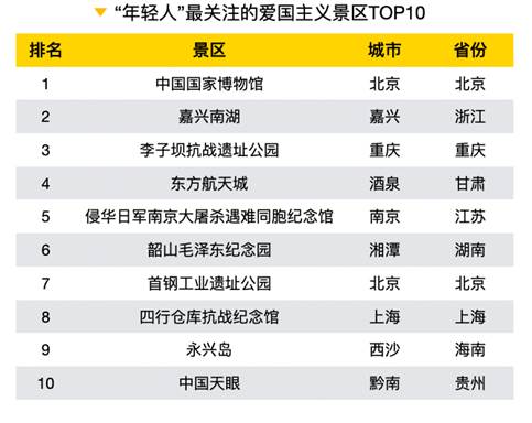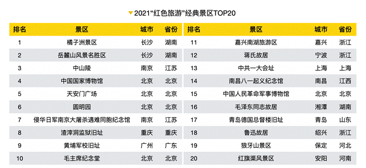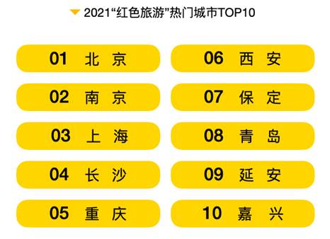 传统红色旅游城市深受欢迎,红色资源吸引人、美好生活留住人趋势更加明显。数据显示,人气最高的传统红色旅游目的地前十分别是北京、南京、上海、长沙、重庆、西安、保定、青岛、延安、嘉兴。北京成为红色旅游人气最高城市,热门景点有中国国家博物馆、天安门、圆明园、毛主席纪念堂、中国人民革命军事博物馆、卢沟桥、中国人民抗日战争纪念馆、宋庆龄同志故居、焦庄户地道战遗址等。长沙的旅游库里不仅有橘子洲头、岳麓山风景名胜区、毛泽东故居等红色资源,还有文和友等美好生活体验创新业态。