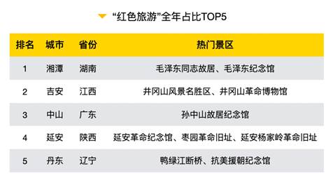 红色旅游成为很多城市经济发展的引擎。搜索热度数据显示,湘潭位列“红色旅游”全年占比排名榜首,红色旅游占到了全部旅游的75%,其余依次为吉安、中山、延安、丹东。