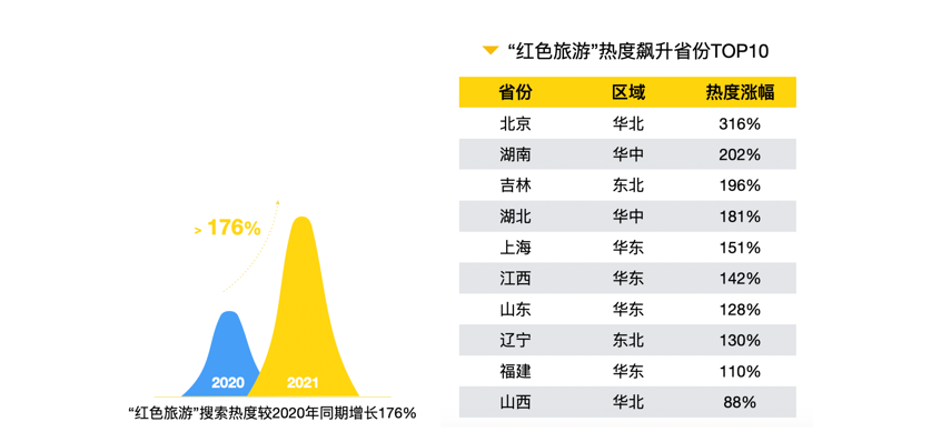 红色旅游发展势头强劲,北京涨幅第一。红色旅游作为精神文化消费的重要方式,受到越来越多游客追捧,在建党100周年的整体氛围烘托下,红色旅游热潮不断升温。马蜂窝数据显示,今年1月以来,“红色旅游”搜索热度较上年同期增长176%,北京以涨幅316%排名第一,湖南、吉林等省份以热度涨幅202%和196%位列第二和第三。每年暑期都是红色旅游最受欢迎的时间段,很多家长在暑期带孩子“打卡”革命旧址。天安门广场、圆明园、中国国家博物馆、毛主席纪念堂、中国人民革命军事博物馆等成为北京游客打卡的“大热门”。吉林省涨幅高,主要是因为红色旅游热度基数低,在长影旧址博物馆、长春电影制片厂、长春一汽等拉动下热度持续攀升。