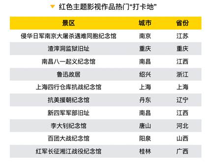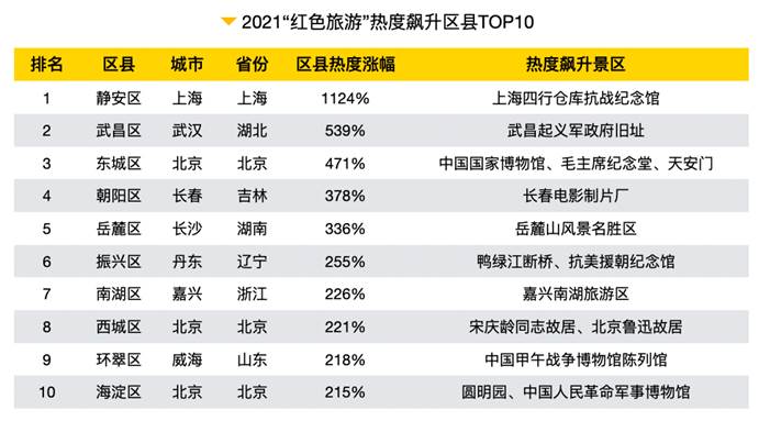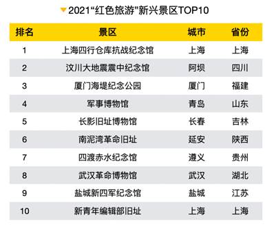 新兴景区深挖红色文化内涵与现代生活需要,同样火热。不仅传统经典的红色景区游客如潮,一些吸引年轻人的红色旅行新兴景区也深受欢迎。长影旧址博物馆热度较2019年同期增长61%,主要是2020年网络媒体报道的《听老“长影人”讲述新中国电影历程》引发了广泛关注。作为“新中国电影的摇篮”的长春电影制片厂,这里诞生了《英雄儿女》、《上甘岭》、《五朵金花》、《英雄儿女》等影响几代人的优秀电影,吸引众多游客到长影旧址博物馆找寻美好的童年回忆。年轻人喜爱的红色主题剧《觉醒年代》使得新青年编辑部旧址热度暴涨。盐城新四军纪念馆在2021年举办了庆祝中国共产党成立100周年的专题展览,给景区带来不少热度。数据显示,2021红色旅游新兴景区中,由热门影视剧《八佰》带火的上海四行仓库抗战纪念馆位列榜首,其余分别为汶川大地震震中纪念馆、厦门海堤纪念公园、山东青岛军事博物馆、长影旧址博物馆、南泥湾革命旧址、四渡赤水纪念馆、武汉革命博物馆、盐城新四军纪念馆、新青年编辑部旧址。