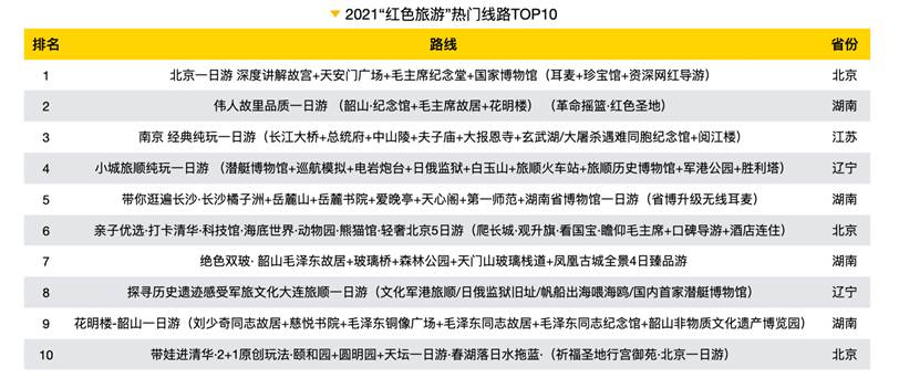 热门红色旅游线路以短距离为主,1日游线路人气高。2021年热门的红色旅游路线以北京、江苏、湖南为主。数据显示,红色旅游线路热度最高分别是北京一日游(深度讲解故宫+天安门广场+毛主席纪念堂+国家博物馆耳麦+珍宝馆+资深网红导游)、(革命摇篮·红色圣地)伟人故里品质一日游(韶山·纪念馆+毛主席故居+花明楼)、南京经典纯玩一日游(长江大桥+总统府+中山陵+夫子庙+大报恩寺+玄武湖/大屠杀遇难同胞纪念馆+阅江楼)等。