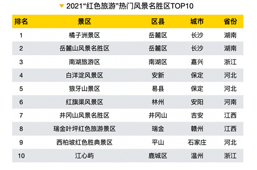 红色旅游经典景区游客如潮,持续成为旅游亮点。习近平总书记先后30余次走访革命遗址、经典景区,持续引领红色旅游的热潮。根据旅游热度数据,2021年经典红色景区热度同比增长89%,中共一大会址热度涨幅243%,井冈山风景名胜区涨幅140%。2021热度高的红色旅游经典景区分别是橘子洲、岳麓山、中山陵、中国国家博物馆、天安门、圆明园、侵华日军南京大屠杀遇难同胞纪念馆、渣滓洞监狱旧址、黄埔军校旧址、毛主席纪念堂、嘉兴南湖、蒋氏故居等。