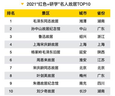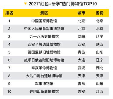 “红色+研学”暑期热。随着红色旅游持续升温,各地红色旅游景区和爱国主义教育基地纷纷推出系列活动,“红色+研学”成暑期旅游市场热门。革命博物馆、纪念馆、名人故居等承载着丰富的革命历史和爱国主义精神,是开展红色教育的实景课堂,深受家长青睐。数据显示,2021热度高的“红色+研学”博物馆分别是中国国家博物馆、中国人民革命军事博物馆、九一八历史博物馆、西安半坡遗址博物馆、德国监狱旧址博物馆、旅顺日俄监狱旧址博物馆、辛亥革命博物馆、大沽口炮台遗址博物馆、青岛军事博物馆、井冈山革命博物馆等。2021人气高的十大“红色+研学”纪念馆分别是毛泽东同志故居、孙中山故居纪念馆、鲁迅故居、上海宋庆龄故居、杨家岭毛泽东旧居、周恩来故居、宋庆龄同志故居、叶剑英故居、朱德故居纪念馆、刘少奇故居。