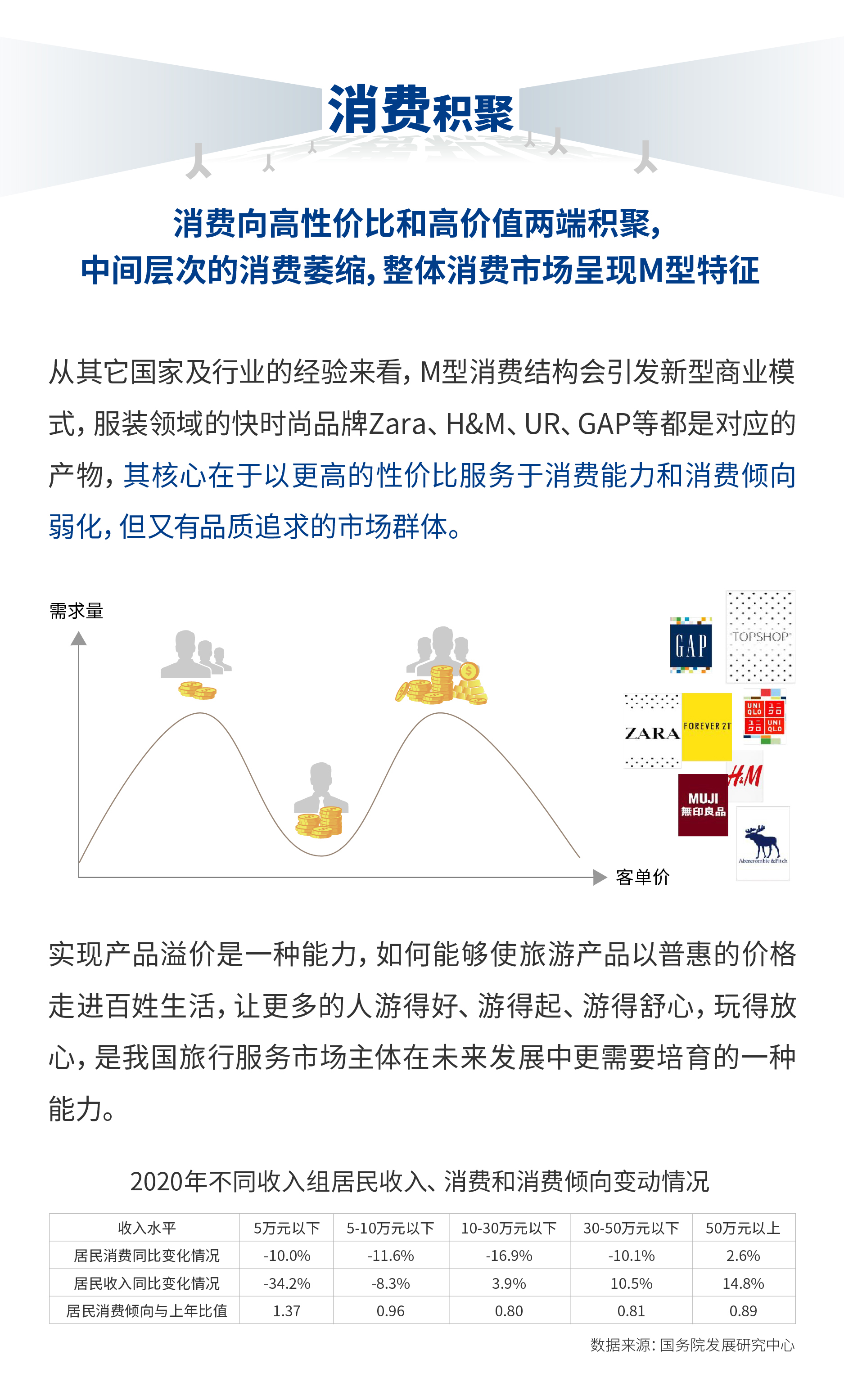 根据国务院发展研究中心的数据,疫情之下中等收入群体消费倾向下降是一个普遍现象。虽然这不是旅游业独有的特征,但是无疑会对旅行服务市场产生影响。M型消费结构的形成可能会促使商业理念、产品形态、定位定价、盈利模式、迭代速度都不同于以往的新型模式的出现,如同快时尚服装品牌之于传统服装业。