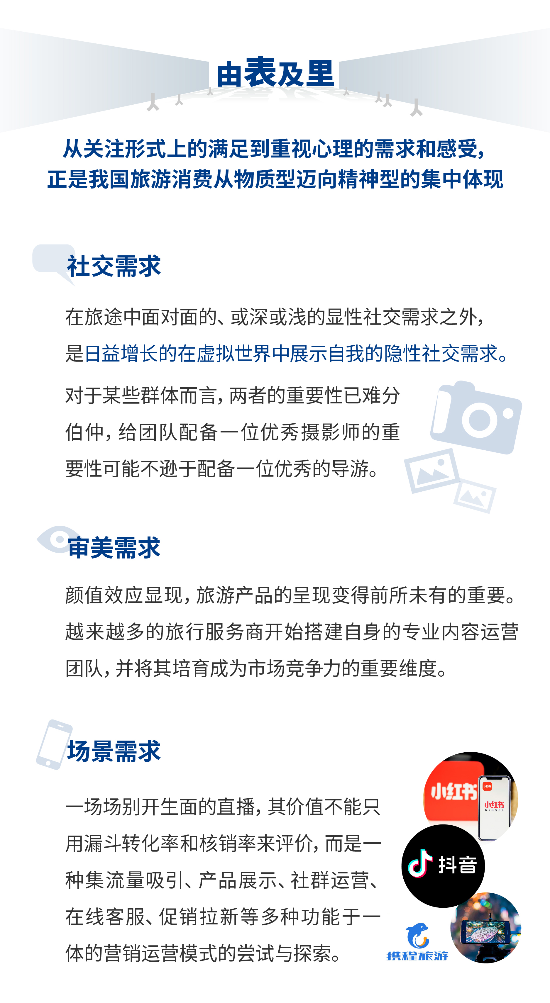 旅游产品的呈现方式与形式变得前所未有的重要。想把自己拍得美美的,也希望见到的、体验到的都是美美的,审美需求已然被深度激发,并不断倒逼旅行服务商和从业人员提升自身发现美、创造美的能力。一张构图精美的海报、一句直击人心的文案都可能在不经意间给游客成功种草。一段段真实且具美感的视频正在打开产品同质化、信息不透明的黑箱,让各家的特色凸显出来。