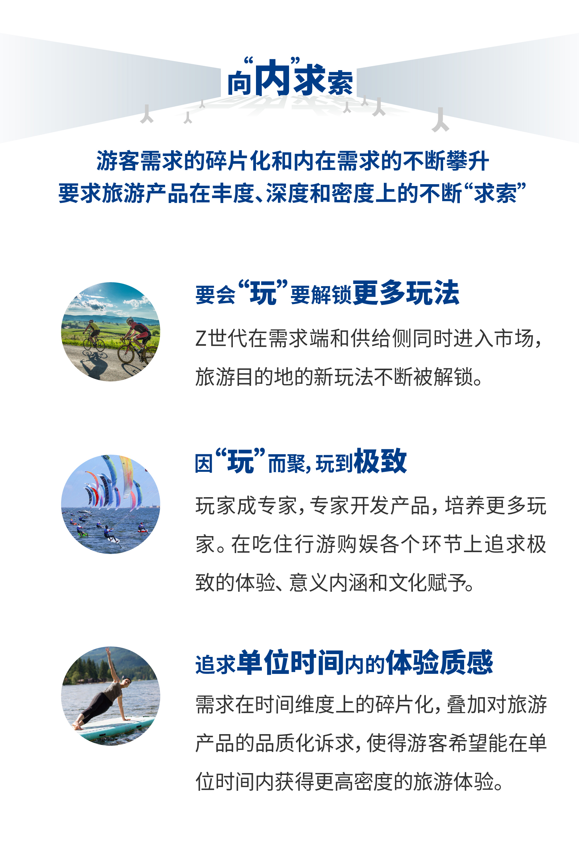 疫情之下的旅游休闲需求,不仅呈现出空间层面从国际向国内、由远程至近程的显性“内”化特征,更表现出从多点打卡到多元玩法,从追求形式到探究内涵,从完整到碎片、由表及里、向内求索的隐性“内”化特征。