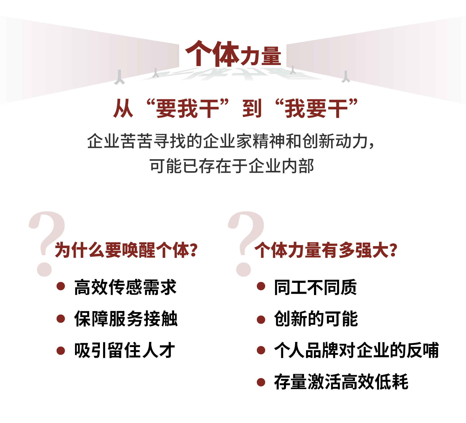 员工当然存在自驱力,但是企业对员工的激励、激活、赋能更加重要。优秀的导游、优秀的产品经理、优秀的营销团队的总和一定等于优秀的企业吗?显然不是。如何将个体有效组织起来,并释放更大的协同效应,是对企业的考验,对管理能力的考验。