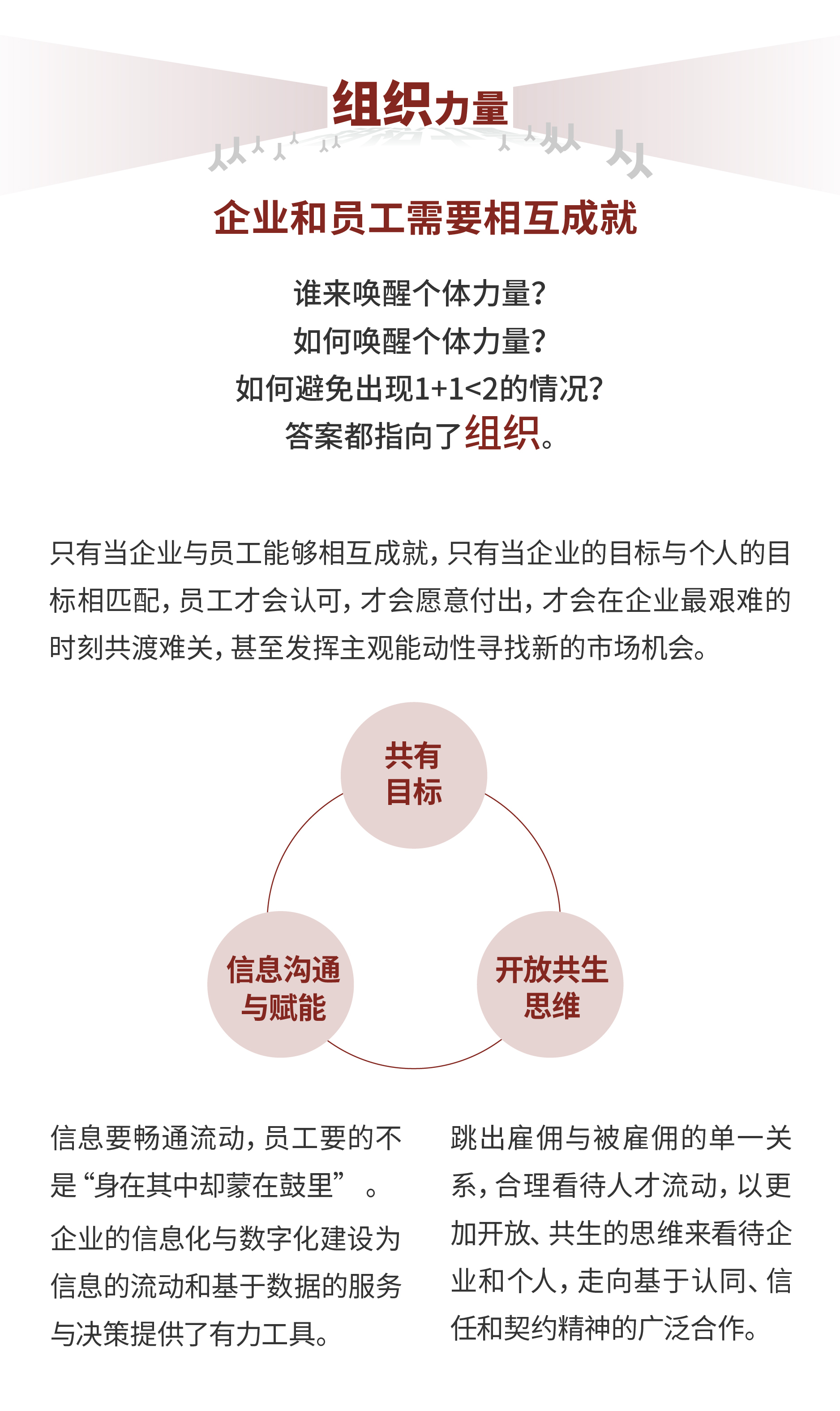 当个体不再囿限于单个企业的封闭边界之内,当人们开始探讨未来企业的形式,甚至思考未来企业还会不会存在,个人与组织的关系已然发生了深刻的变化。当企业的存在不再只为了股东的利益,商业和社会的发展要实现国民的共同富裕,未来还能够将个体组织起来的力量,可能不再是物理上的连接和制度上的约束,而是来自个体间内心的相互认同,来自组织内的哲学共有,来自于实现组织目标的同时,也能够让每个人自由而充分地发展。
