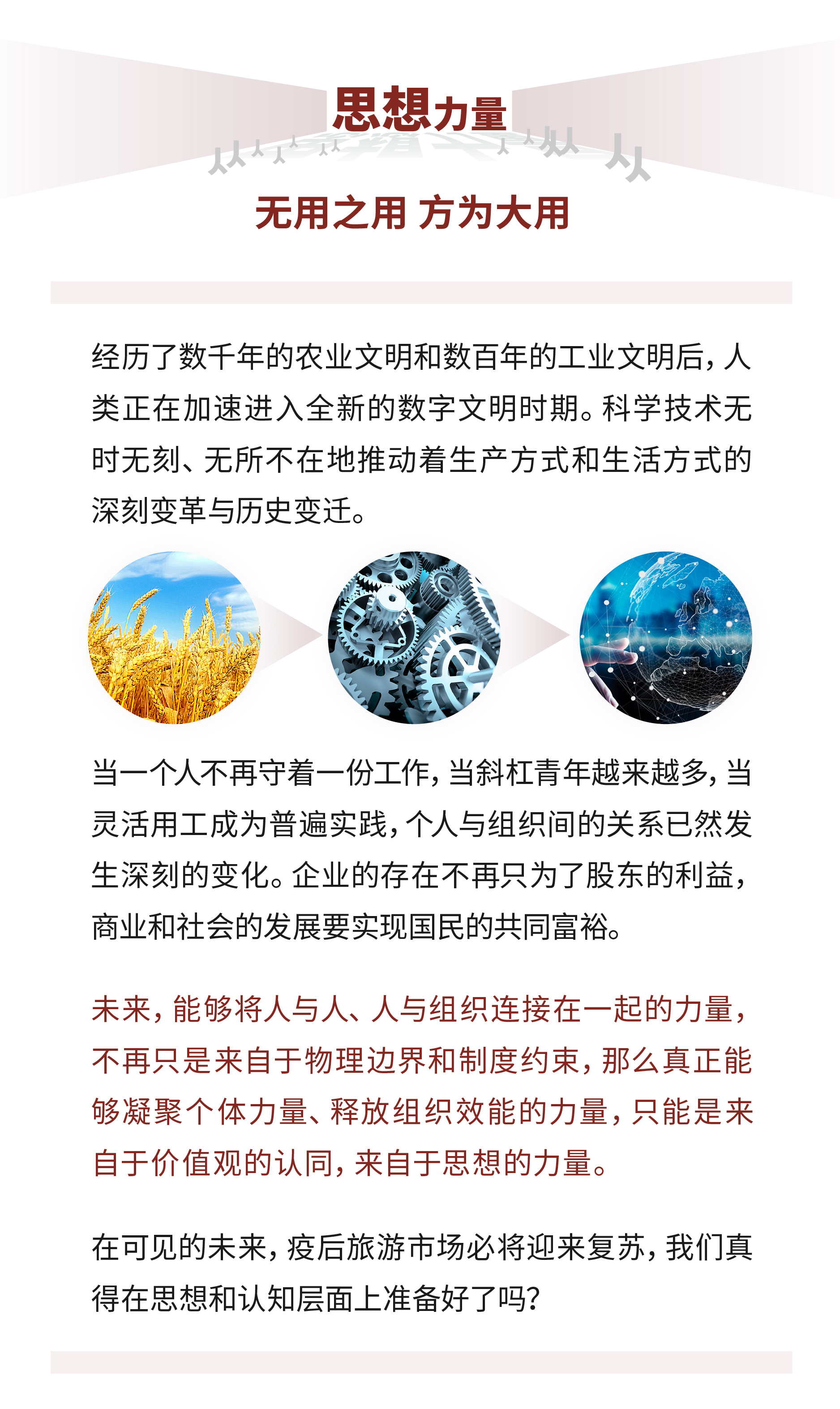 激活个体,不只是一线员工,而是所有员工。旅行服务业是多触点服务行业,唯有以供给侧每位员工去链接需求端的个体,才能快速感知需求并向内传导;唯有保障每个服务触点的服务质量,多个触点间的顺畅连接,才能造就一次完整而卓越的体验。对员工的激活不仅是企业的需求,更是员工对自己的需求。旅行服务业正吸引着一大批的90后、00后个体的加入,潜能的开发、上升的空间、组织的价值观、工作是否开心、个性是否得到尊重都是薪酬以外重要的择业考量因素。一旦无法满足,他们可能不会选择躺平,而是转身离开。