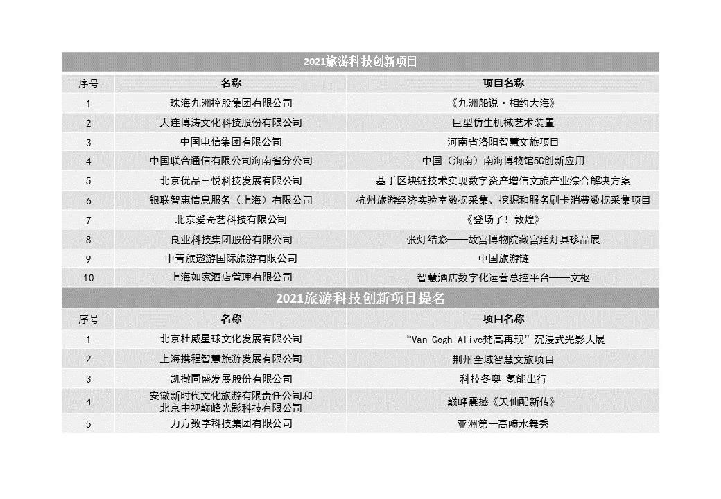 除了这十家以外,我们还有五家优秀的企业项目获得了“2021旅游科技创新项目”提名,他们分别是:北京杜威星球文化发展有限公司“‘VanGoghAlive’梵高再现”沉浸式光影大展,安徽新时代文化旅游有限责任公司、北京中视巅峰光影科技有限公司“巅峰震撼《天仙配新传》”,凯撒同盛发展股份有限公司“科技冬奥氢能出行”,上海携程智慧旅游发展有限公司“荆州全域智慧文旅项目”,力方数字科技集团有限公司“亚洲第一高喷水舞秀”。
