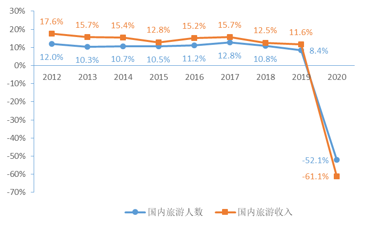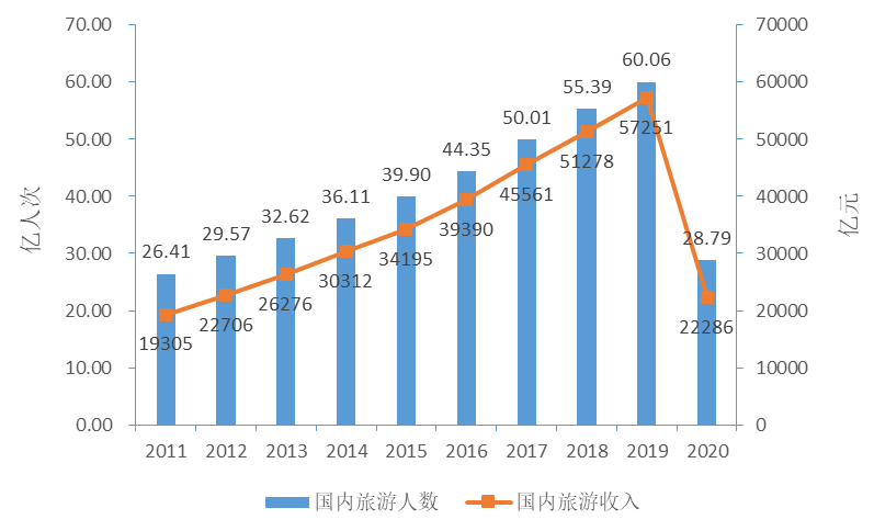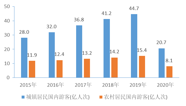 受新型冠状病毒肺炎疫情影响,2020年国内旅游人数28.79亿人次,比2019年下降52.1%。其中,城镇居民国内旅游人数下降幅度更大,达到53.8%,农村居民国内旅游人数下降47.0%。