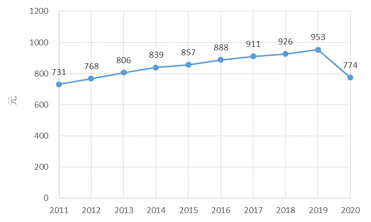2020年国内旅游人均花费774.14元,比2019年同比下降18.8%。其中,城镇居民人均花费870.25元,下降18.1%。农村居民人均花费530.47元,下降16.4%。