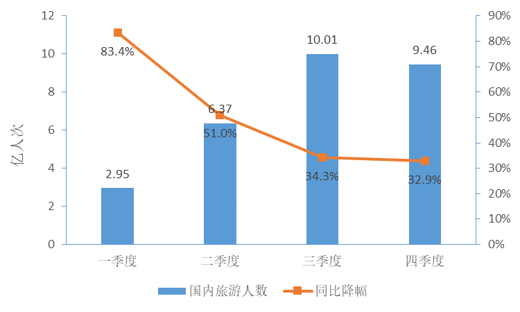 2020年文化和旅游部通过积极争取纾困政策、指导地方用足用好政策、抓好项目建设、推动产业创新发展、加大金融支持产业高质量发展等措施,推动旅游业复苏取得显著成效,国内旅游呈现分季度降幅收窄趋势。