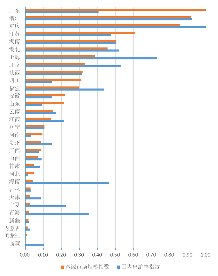 2020年广东、浙江、重庆、江苏、湖南、湖北、上海、北京、陕西等省市既有较大的国内旅游客源市场规模,又有较高的国内旅游出游率。